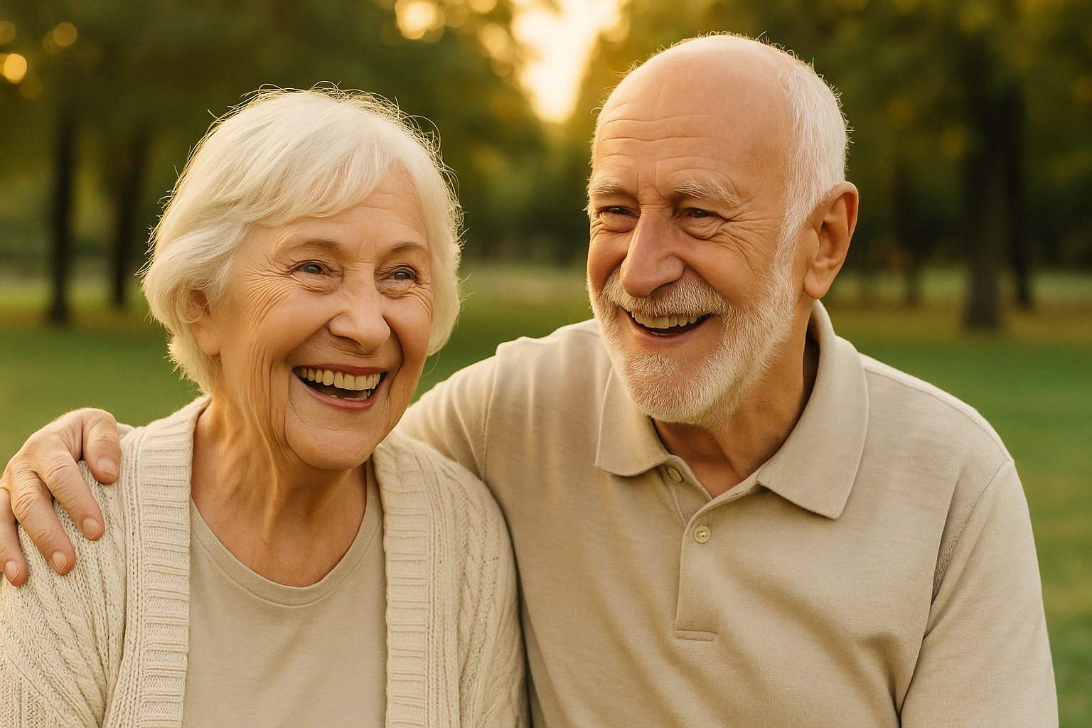 A heartwarming photo of an elderly couple smiling in a park, symbolizing respect, dignity, and the joy of celebrating the International Day of Older Persons at Villa Alegría.